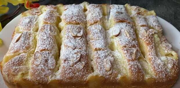 Перед выпеканием можно украсить пирог миндальной крошкой. После выпекания пирог стоит посыпать сахарной пудрой.