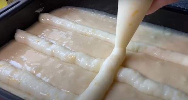 Кремовую основу перекладываем в кондитерский мешок, узором выкладываем на поверхность теста.